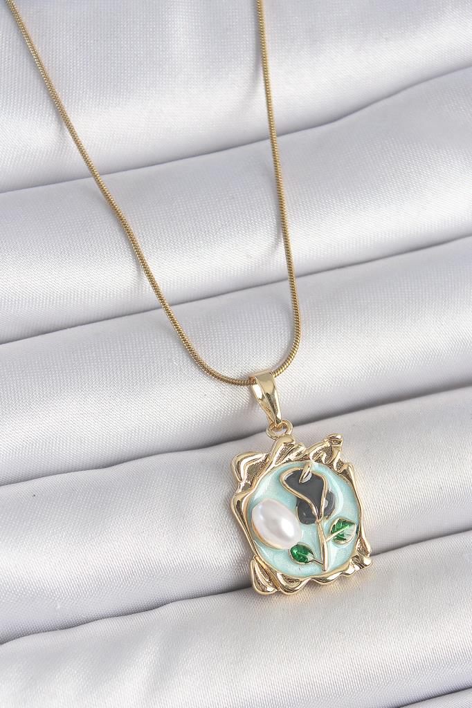 316L Çelik Gold Renk Zincir Mavi Mineli Çiçek İşlemeli İnci Detay Portre Model Kadın Kolye - BKO10186
