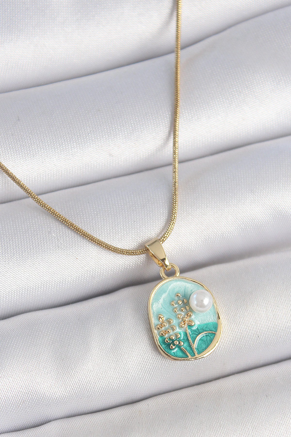 316L Çelik Gold Renk Zincir Mavi Mineli İncili Çiçek İşlemeli Portre Model Kadın Kolye - TJ-BKO10179