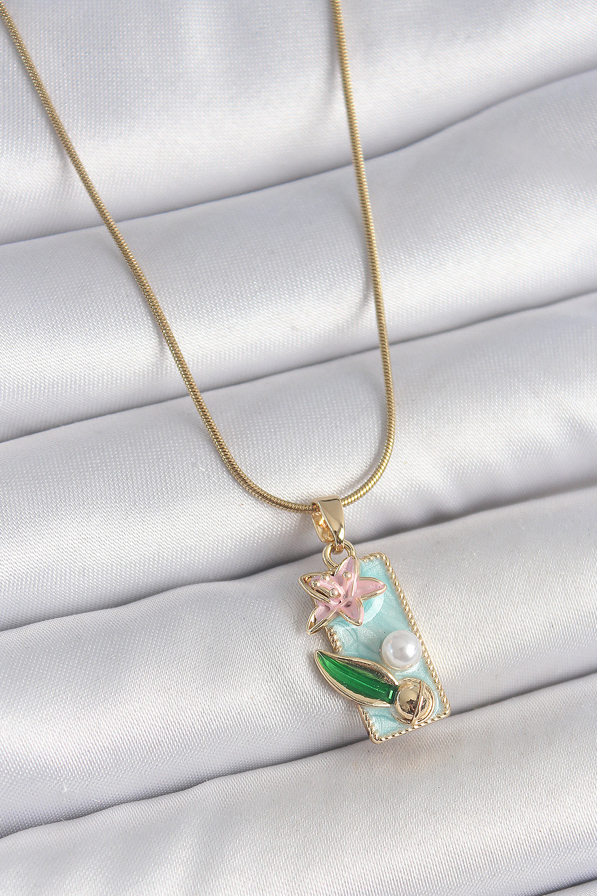 316L Çelik Gold Renk Zincir Mavi Mineli Pembe Çiçek İşlemeli İnci Detay Dikdörtgen Portre Model Kadın Kolye - TJ-BKO10136