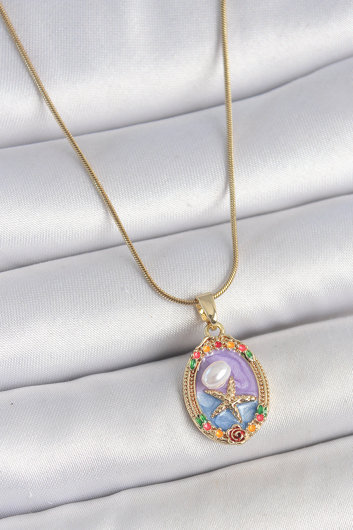 316L Çelik Gold Renk Zincir Mix Renk Deniz Yıldız İşlemeli Renki Çiçek Detay Portre Model Kadın Kolye - TJ-BKO10161