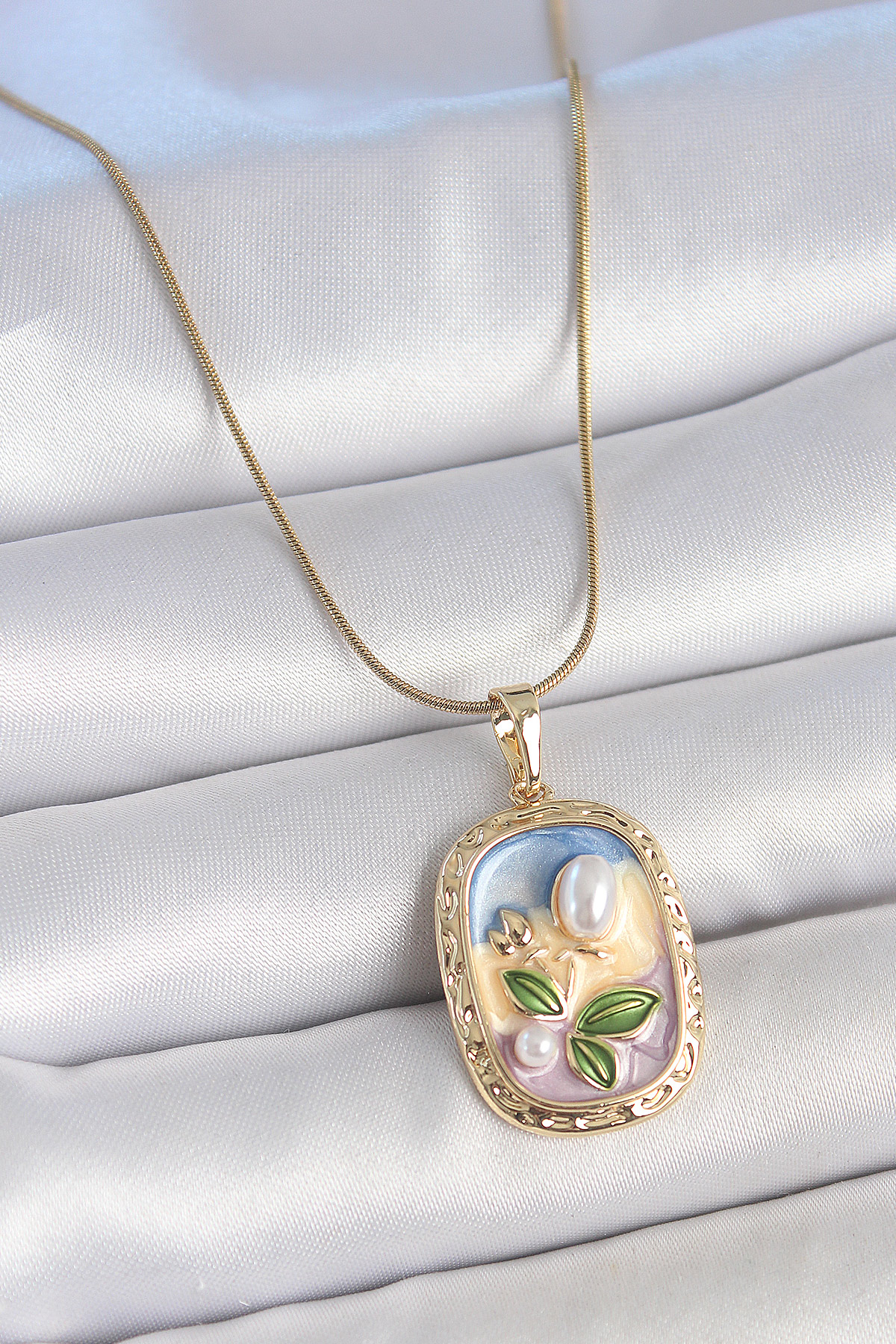 316L Çelik Gold Renk Zincir Mix Renk Mineli İnci Çiçek İşlemeli Portre Model Kadın Kolye - TJ-BKO10152
