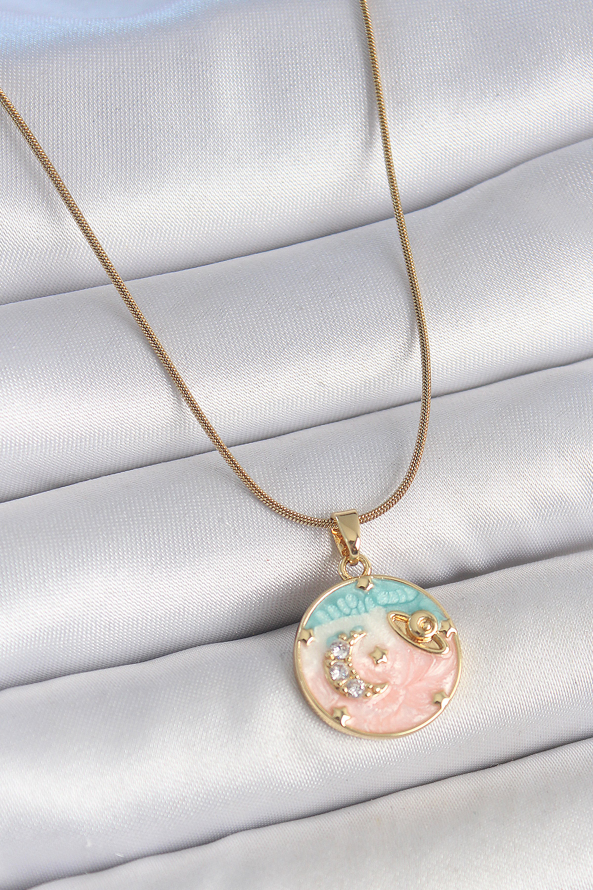 316L Çelik Gold Renk Zincir Mix Renk Mineli Zirkon Taşlı Gezegen İşlemeli Yıldız Detay Madalyon Model Kadın Kolye - TJ-BKO10133