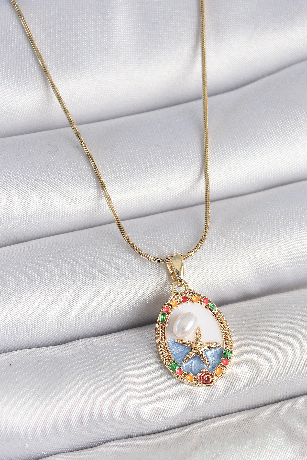316L Çelik Gold Renk Zincir Mix Renkli Deniz Yıldız İşlemeli İnci Detay Portre Model Kadın Kolye - TJ-BKO10162