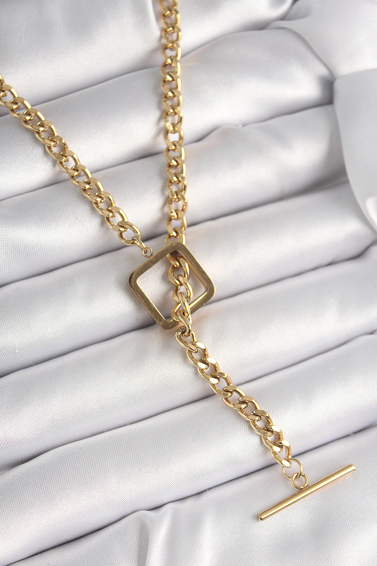 316L Çelik Gold Renk Zincir Model Kare Figür Kadın Kolye - TJ-BKO9939
