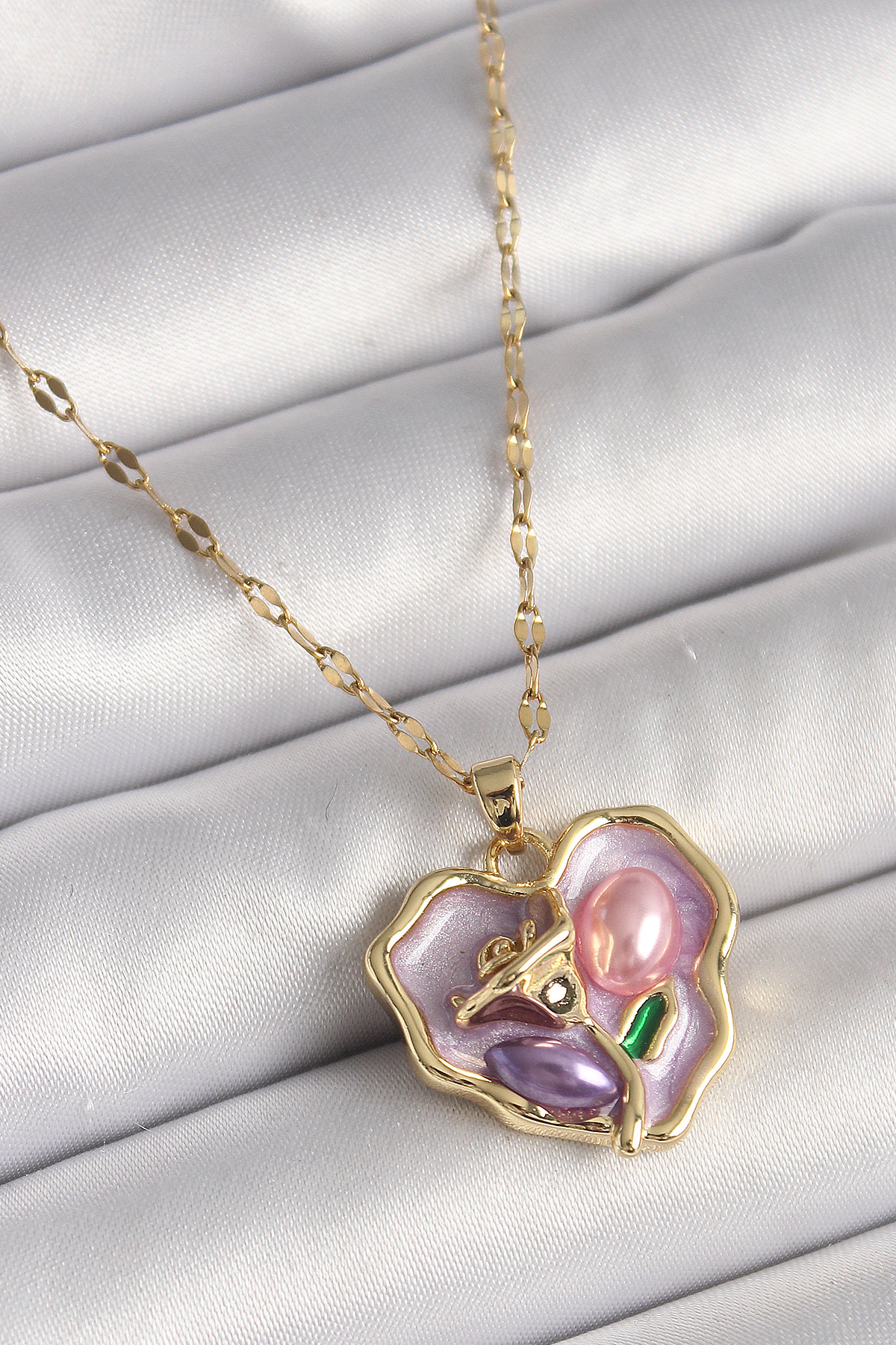 316L Çelik Gold Renk Zincir Mor Çiçek İşlemeli Zirkon Taş Detaylı Kalp Portre Model Kadın Kolye - TJ-BKO9881