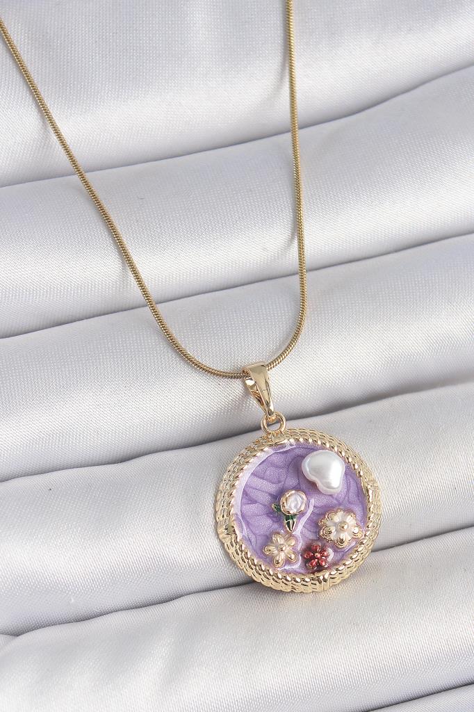 316L Çelik Gold Renk Zincir Mor Mineli İncili Çiçek İşlemeli Madalyon Model Kadın Kolye - BKO10175