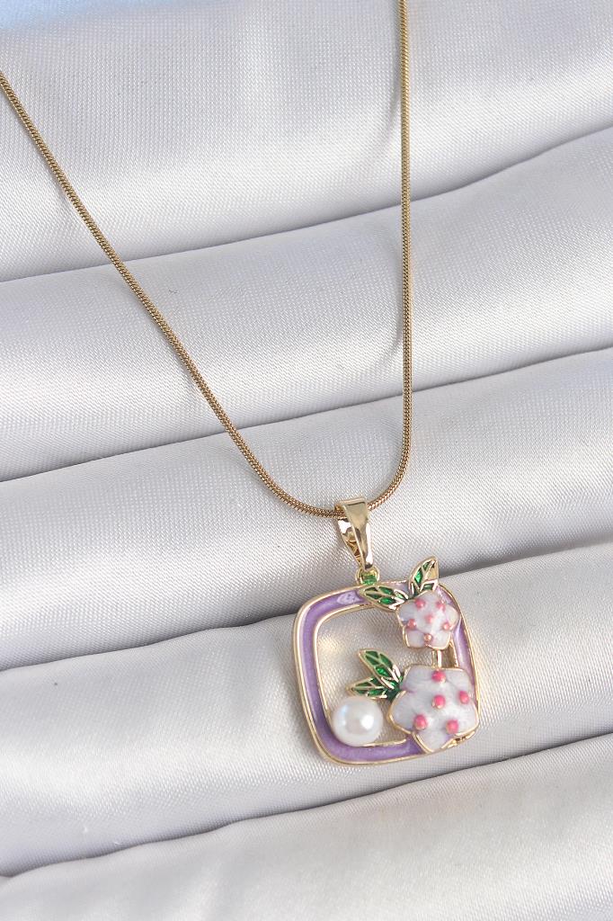 316L Çelik Gold Renk Zincir Mor Mineli Kare Model Çiçek İşlemeli İnci Detay Kadın Kolye - TJ-BKO10159
