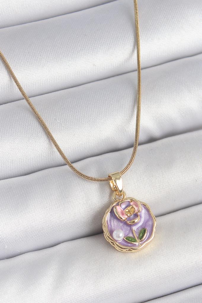 316L Çelik Gold Renk Zincir Mor Minimal Çiçek İşlemeli İnci Detay Portre Model Kadın Kolye - BKO10128