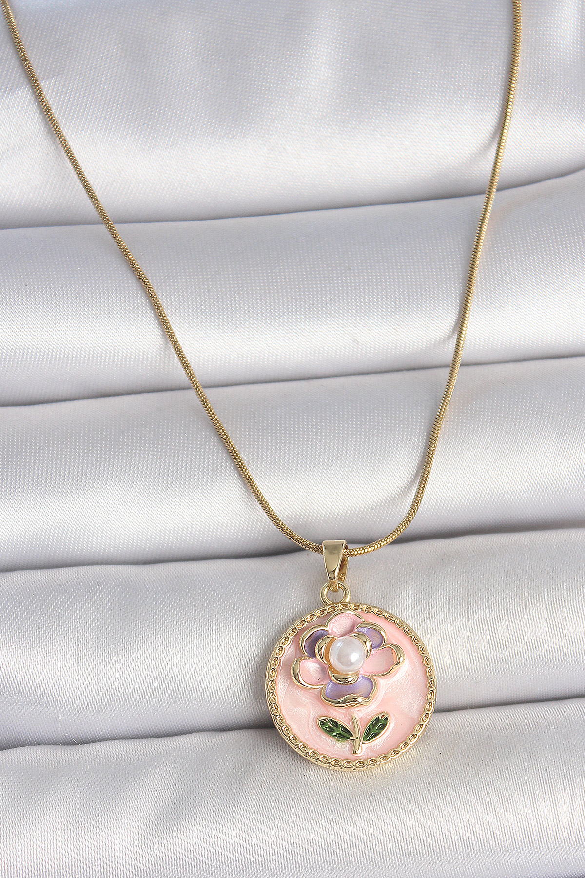 316L Çelik Gold Renk Zincir Pembe Çiçek İşlemeli İnci Detay Portre Model Kadın Kolye - TJ-BKO10087