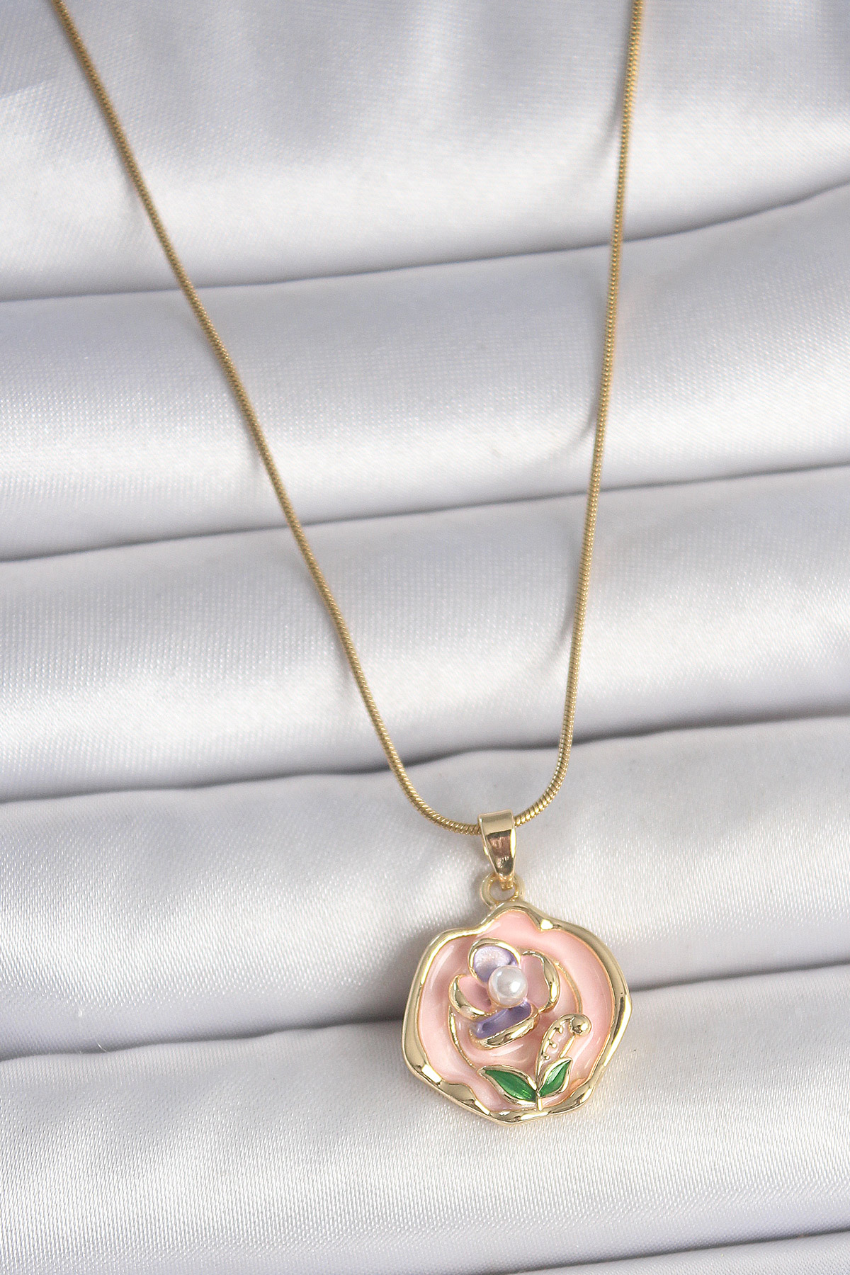 316L Çelik Gold Renk Zincir Pembe Renkli Çiçek İşlemeli İnci Detay Portre Model Kadın Kolye - TJ-BKO10075