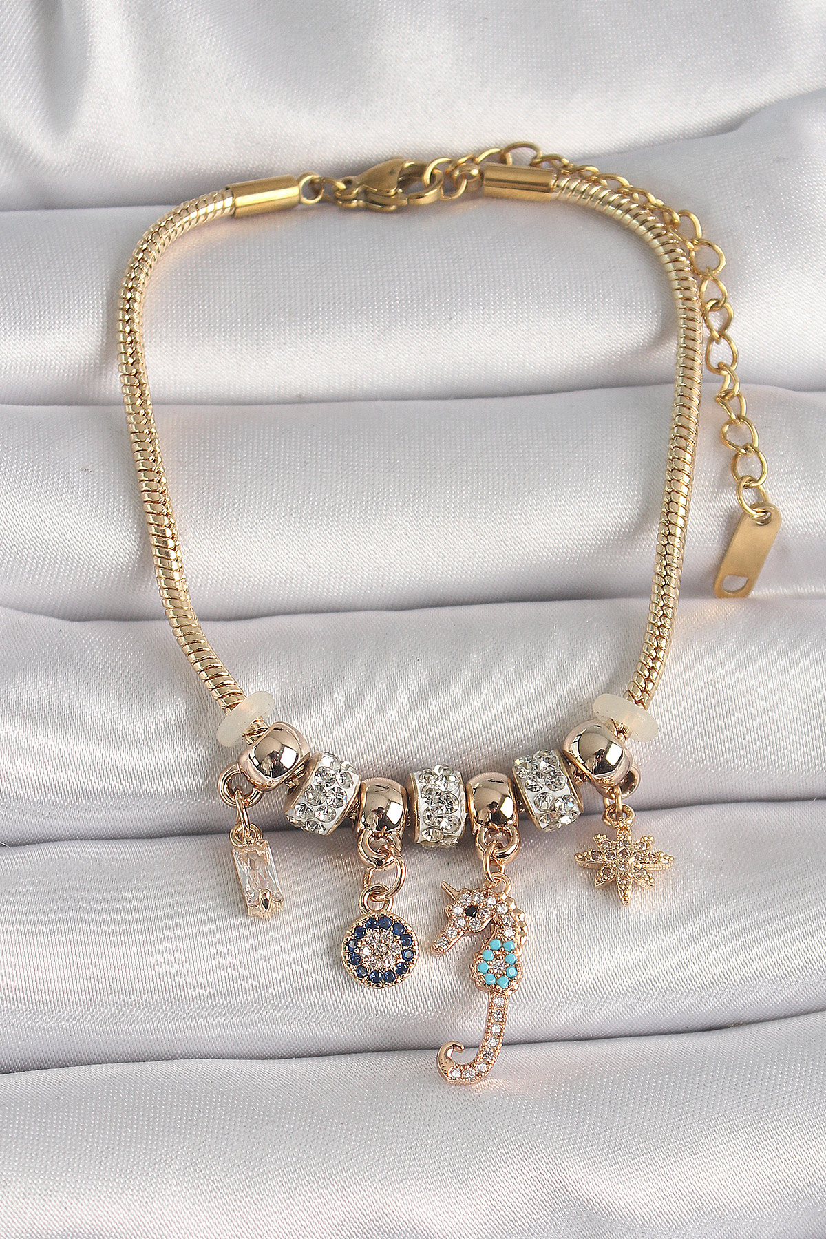 316L Çelik Gold Renk Zincir Sallantı Zirkon Taşlı Deniz Atı Figür Nazar Boncuk Detay Kadın Bileklik - TJ-BB6708
