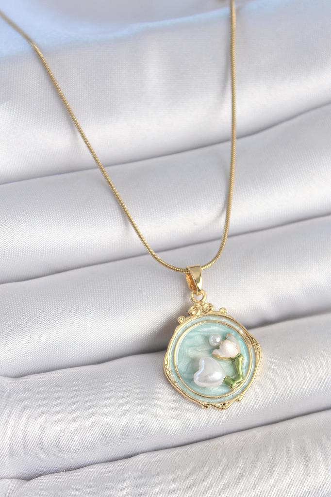 316L Çelik Gold Renk Zincir Turkuaz Mineli İncili Çiçek İşlemeli Portre Model Kadın Kolye - BKO10150