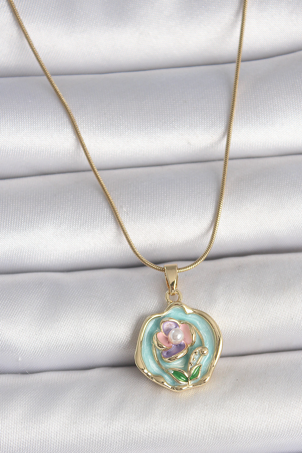 316L Çelik Gold Renk Zincir Turkuaz Pembe Mor Çiçek İşlemeli İnci Detay Portre Model Kadın Kolye - TJ-BKO10073