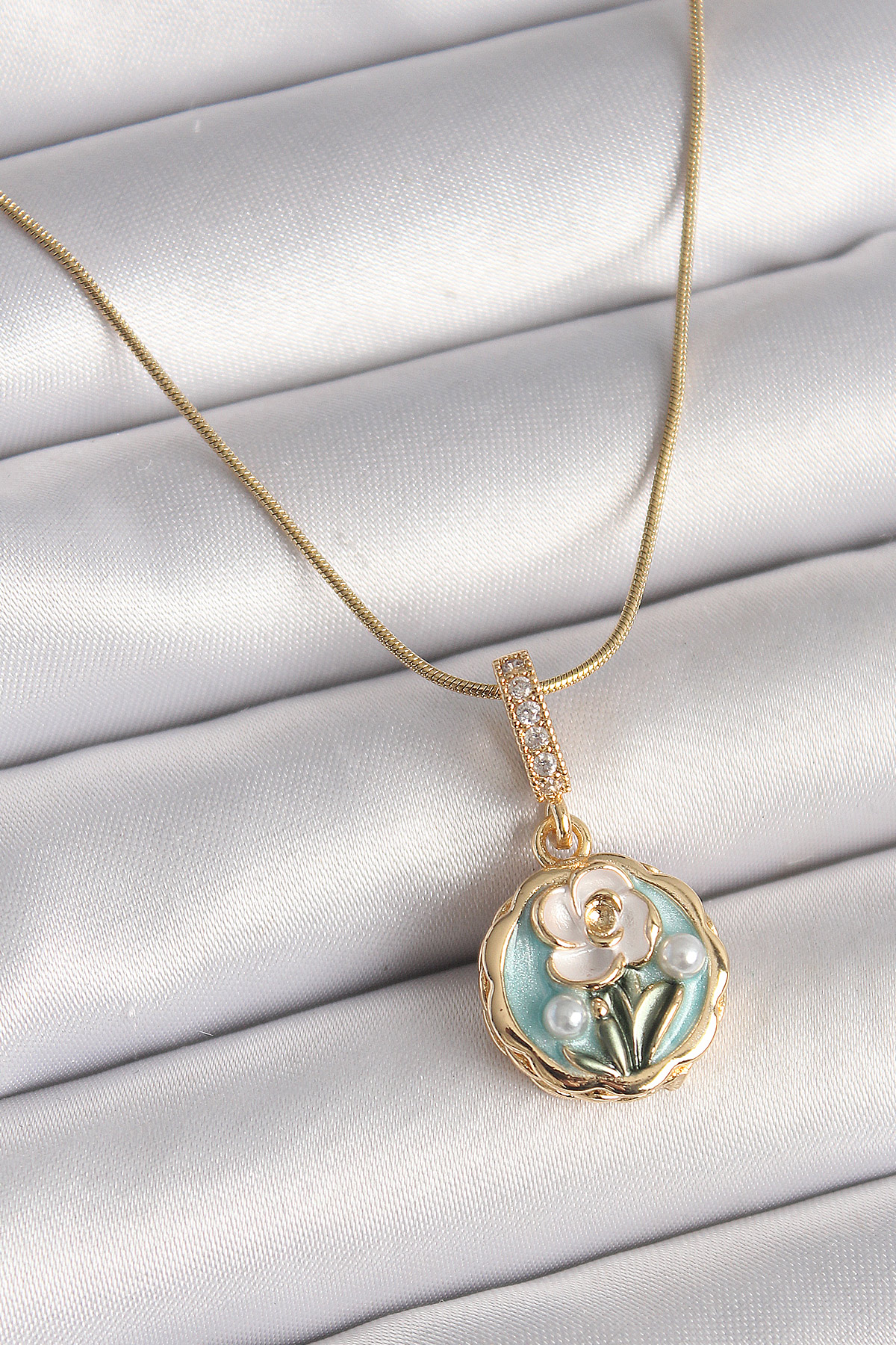 316L Çelik Gold Renk Zincir Zirkon Taş Detaylı Daire Çiçek İşlemeli Portre Model Kadın Kolye - TJ-BKO9898