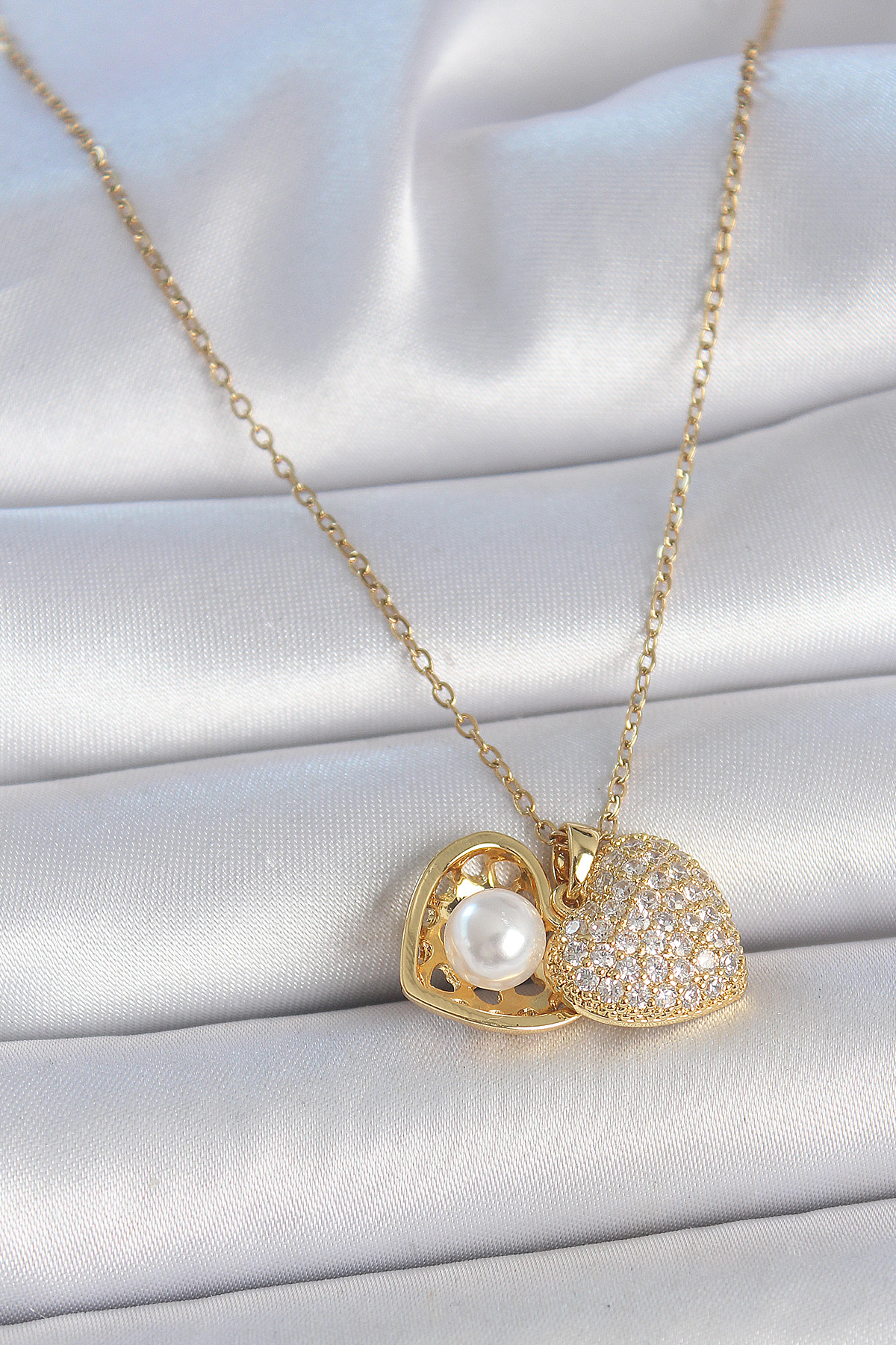 316L Çelik Gold Renk Zincir Zirkon Taşlı Açılır İncili Kalp Model Kadın Kolye - TJ-BKO10031