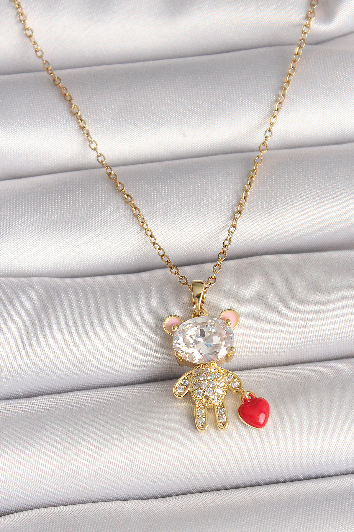 316L Çelik Gold Renk Zincir Zirkon Taşlı Ayıcık Model Kırmızı Kalp Detay Kadın Kolye - TJ-BKO9986