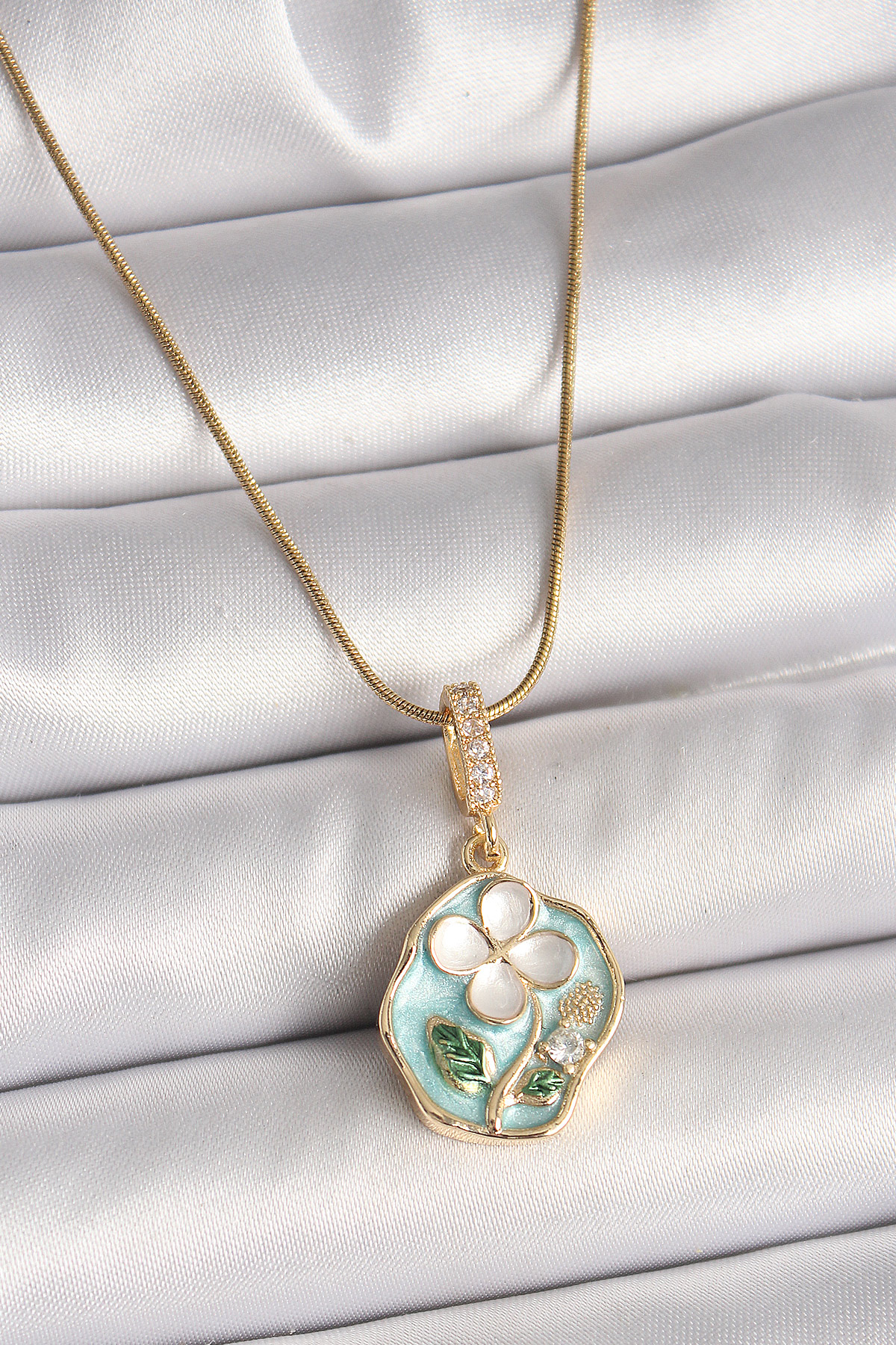 316L Çelik Gold Renk Zincir Zirkon Taşlı Beyaz Yonca İşlemeli Mavi Portre Model Kadın Kolye - TJ-BKO9909