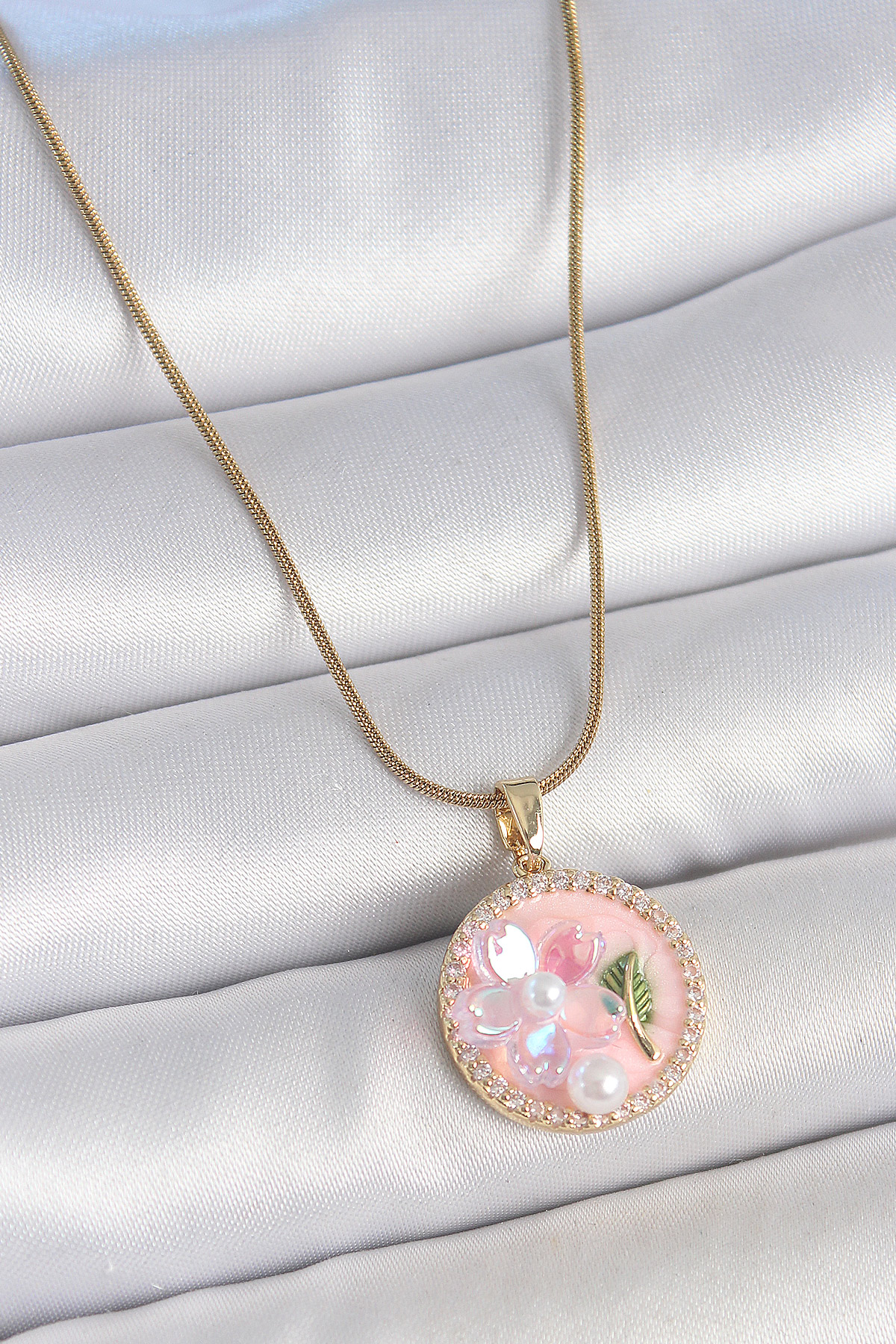 316L Çelik Gold Renk Zincir Zirkon Taşlı Pembe Mineli Çiçek İşlemeli İnci Detay Portre Model Kadın Kolye - TJ-BKO10139