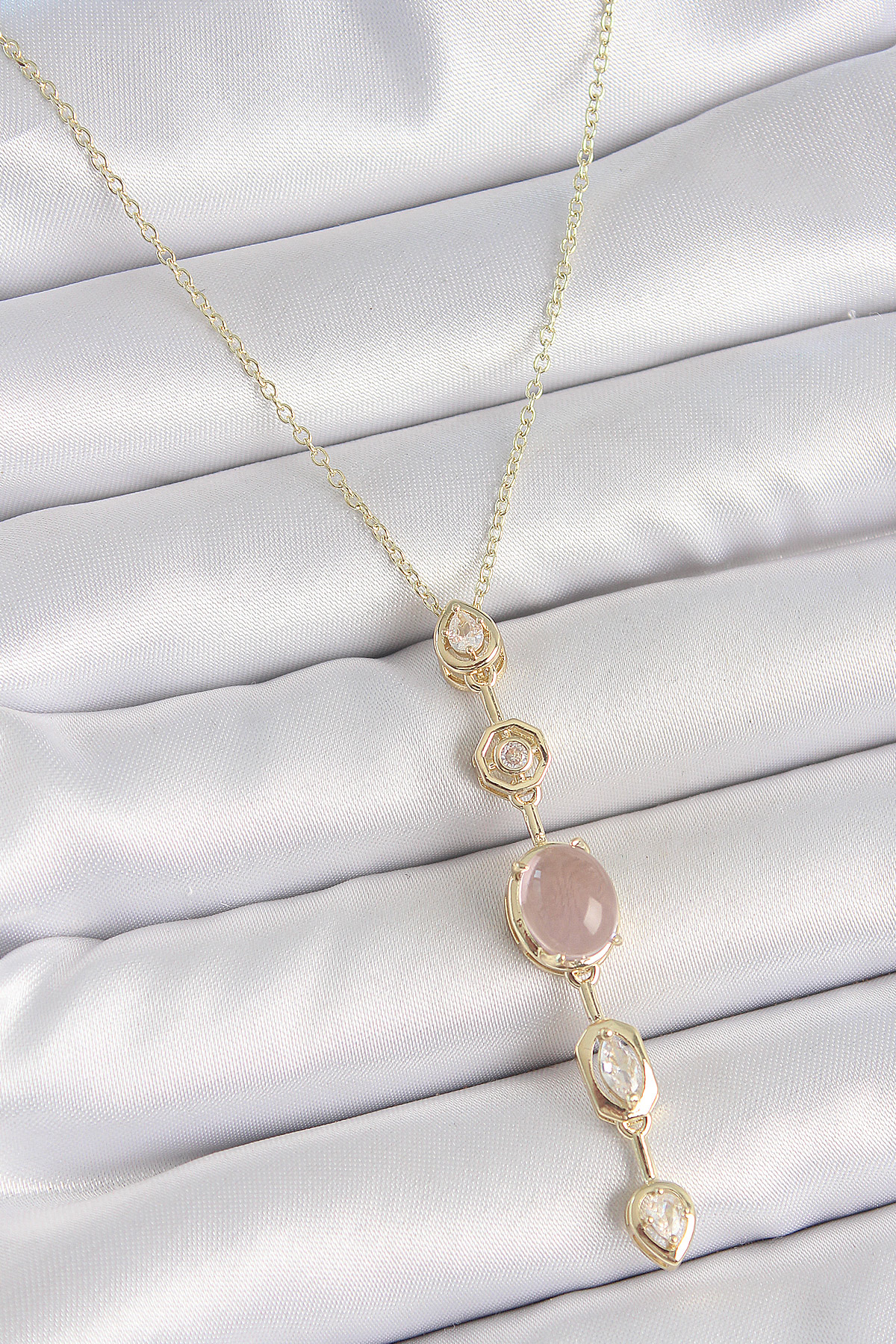 316L Çelik Gold Renk Zincir Zirkon Taşlı Pembe Mineli Y Model Dekolta Kadın Kolye - TJ-BKO10208