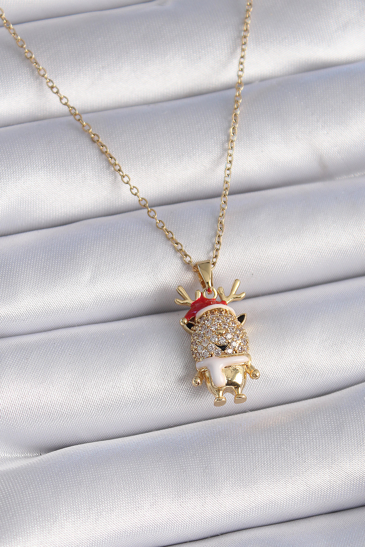 316L Çelik Gold Renk Zincir Zirkon Taşlı Yılbaşı Temalı Ren Geyiği Figür Kadın Kolye - TJ-BKO9437