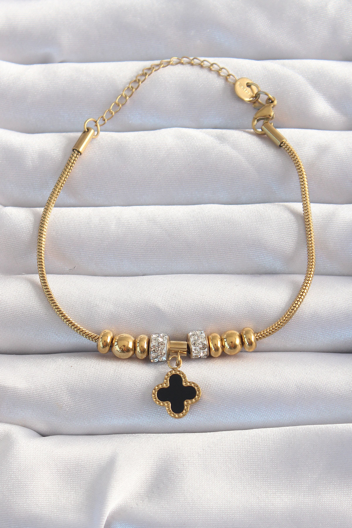 316L Çelik Gold Renk Zirkon Taş Aksesuarlı Siyah Mineli Yonca Bileklik - TJ-BB6229