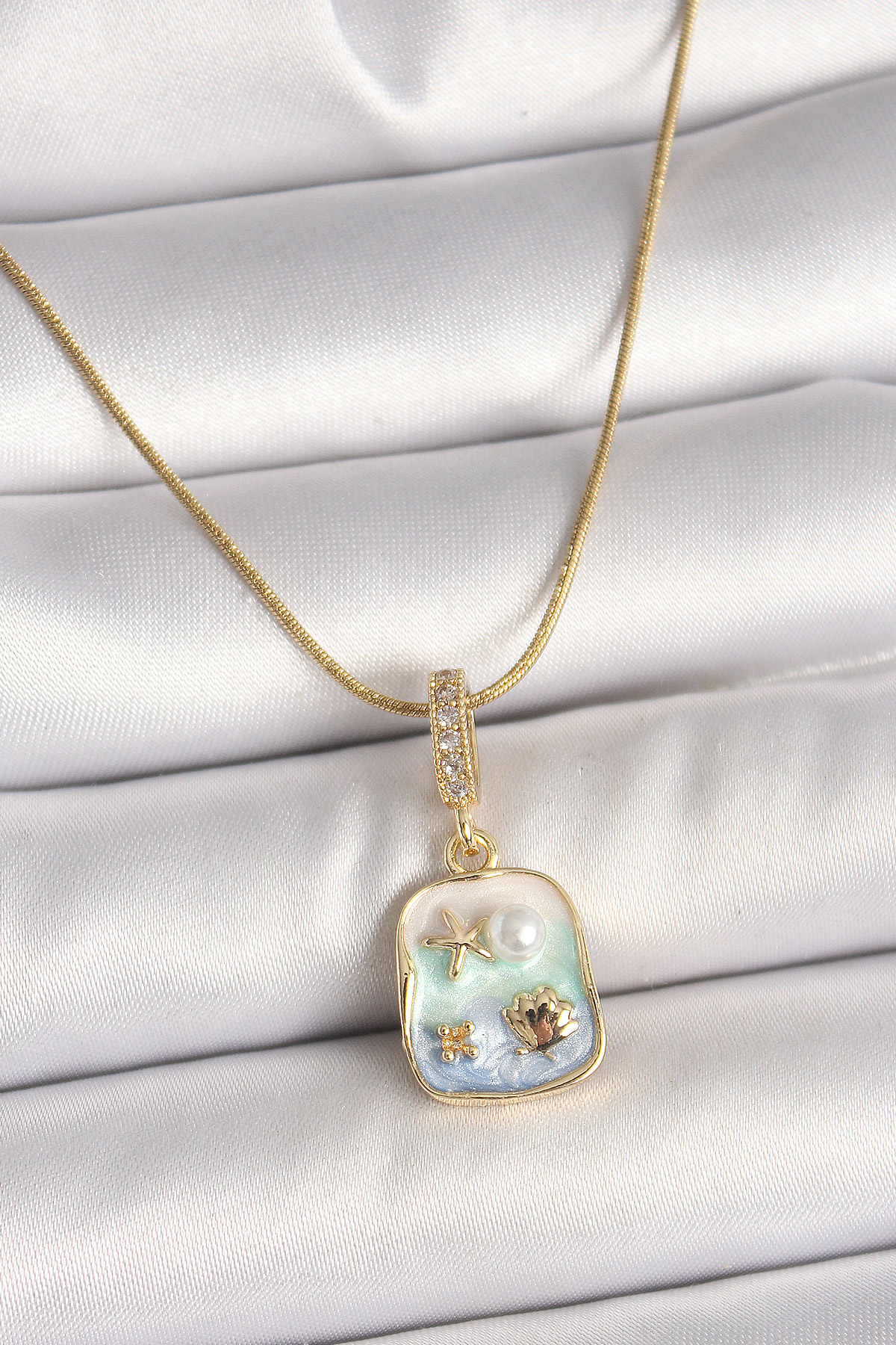 316L Çelik Gold Renk Zirkon Taşlı Mavi Deniz Kabuğu Yıldızı İşlemeli Portre Model Kadın Kolye - TJ-BKO9916