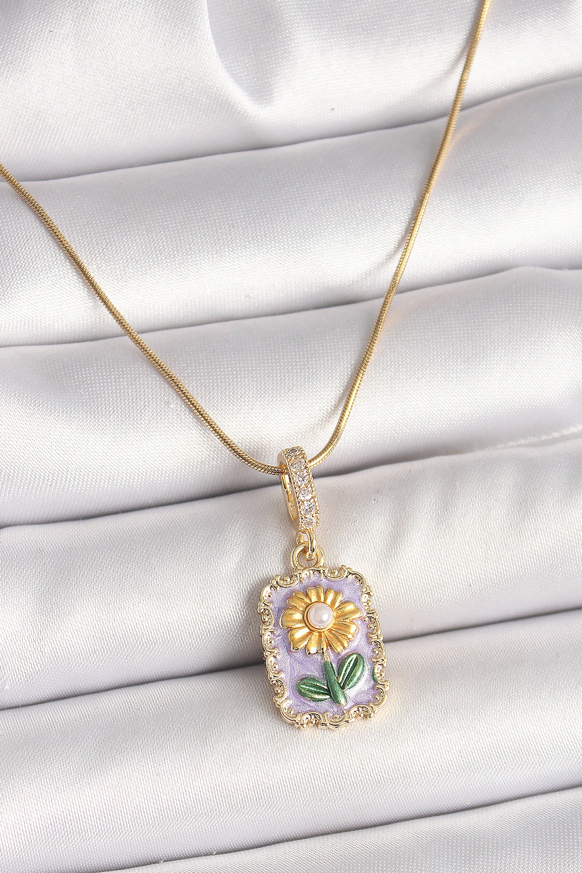 316L Çelik Gold Renk Zirkon Taşlı Mor Papatya İşlemeli Portre Model Kadın Kolye - TJ-BKO9915