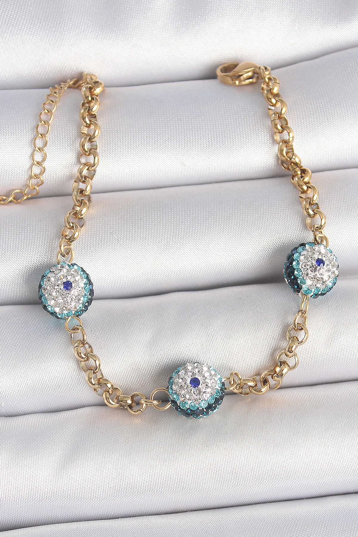 316L Çelik Gold Renk Zirkon Taşlı Nazar Boncuk Model Kadı Bileklik - TJ-BB6958
