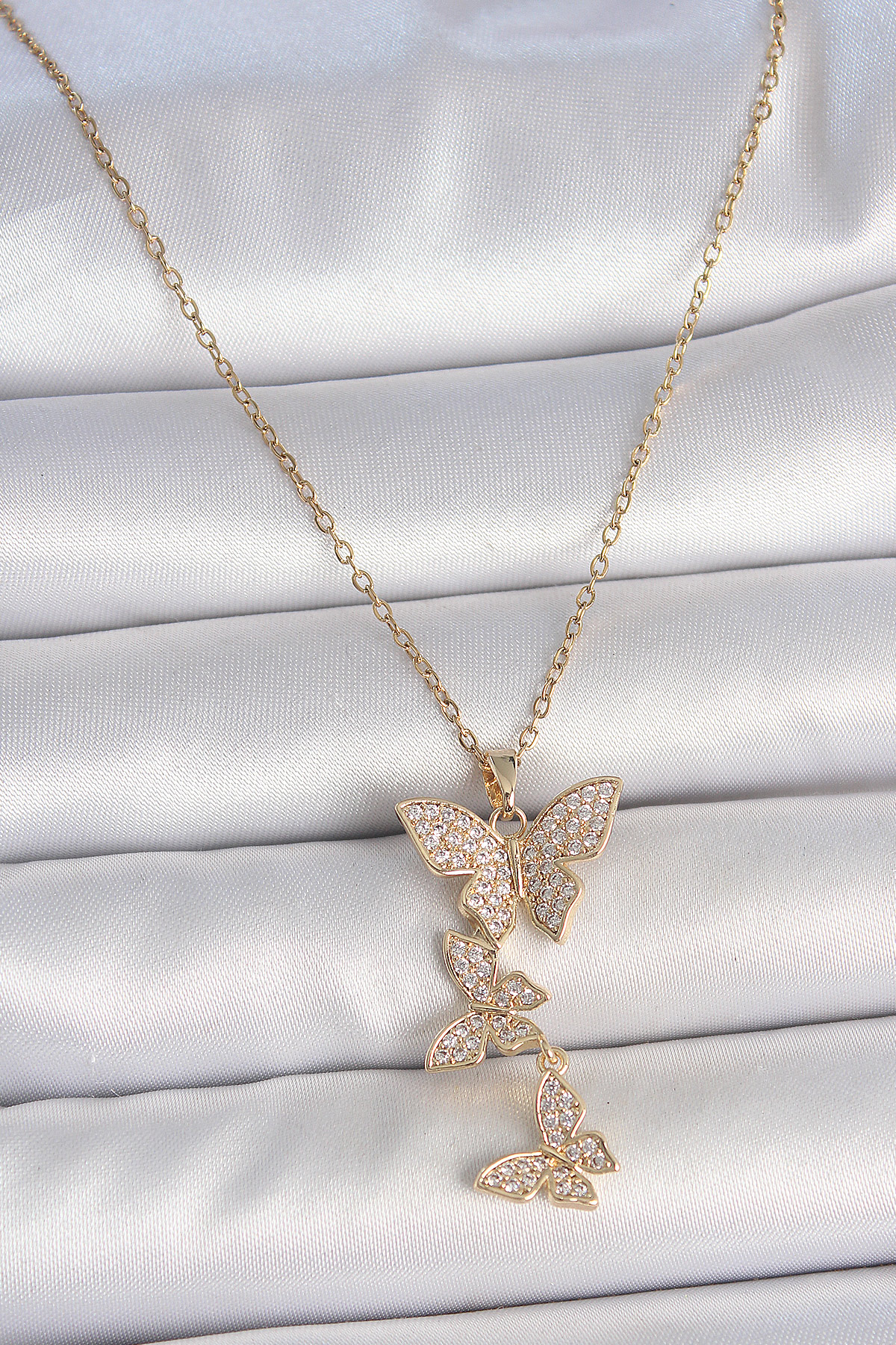 316L Çelik Gold Renk Zirkon Taşlı Sallantı Kelebek Model Kadın Kolye - TJ-BKO10088