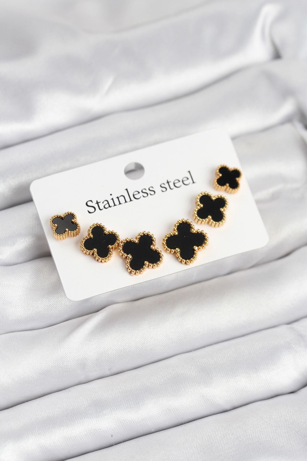 316L Çelik Gold Siyah Renk 3 Boy Yonca Küpe Seti - TJ-BKP11235