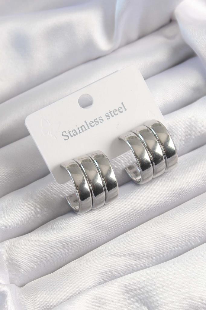 316L Çelik Gümüş Renk 3lü Görünüm Bombe Model Yarım Halka Küpe - TJ-BKP9490