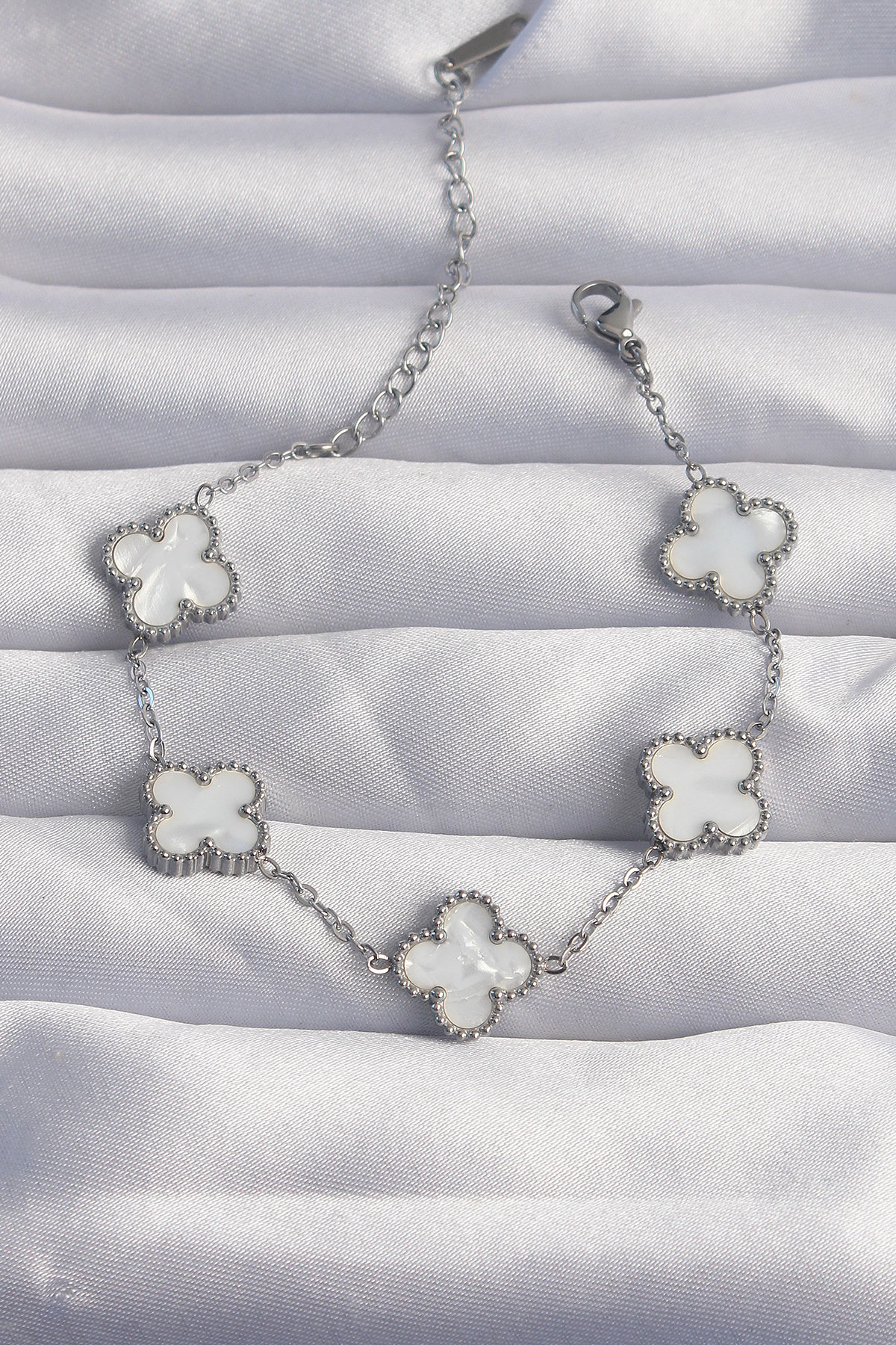 316L Çelik Gümüş Renk Beyaz Sedefli Yonca Bileklik - TJ-BB6261