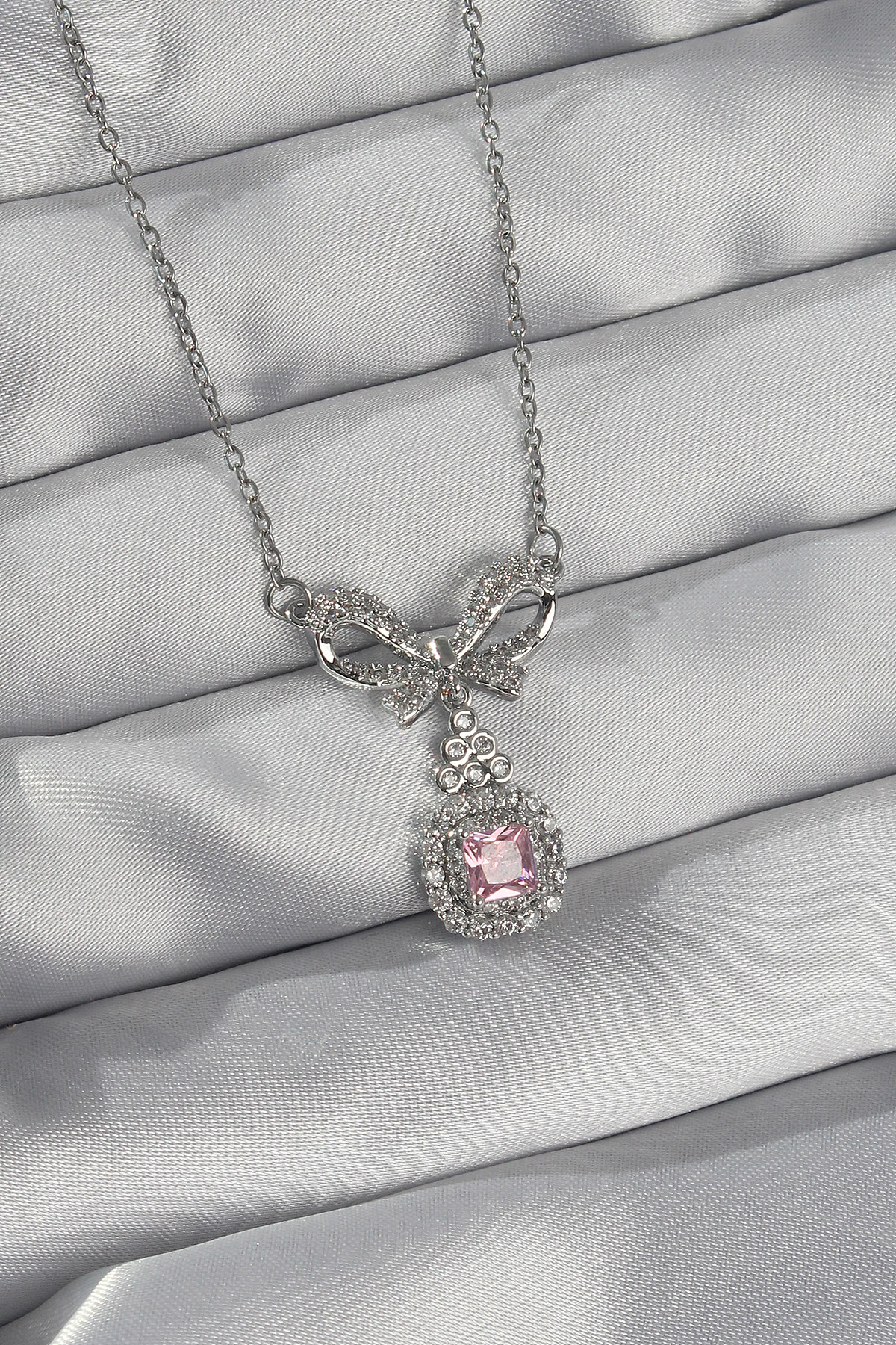 316L Çelik Gümüş Renk Fiyonk Detay Pembe Zirkon Taşlı Tektaş Kolye - TJ-BKO8923