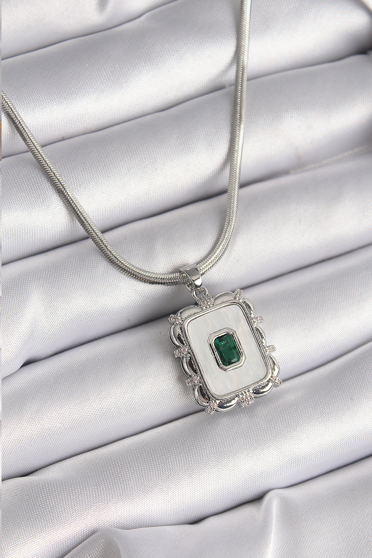 316L Çelik Gümüş Renk İtalyan Zincir Beyaz Sedefli Kare Portre Model Zümrüt Taş Detay Kadın Kolye - TJ-BKO9596