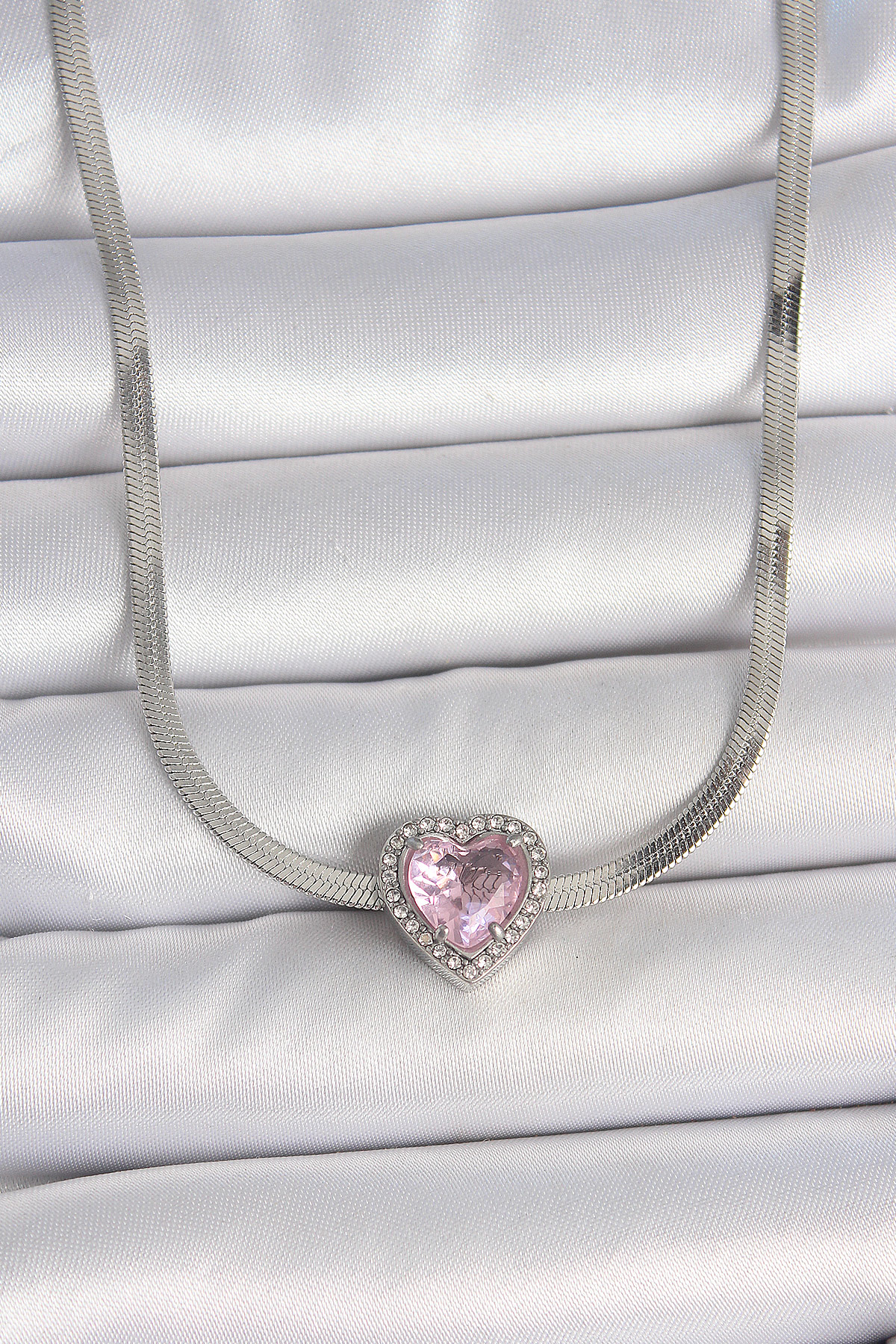 316L Çelik Gümüş Renk İtalyan Zincir Pembe Zirkon Taşlı Kalp Model Kadın Kolye - TJ-BKO10119