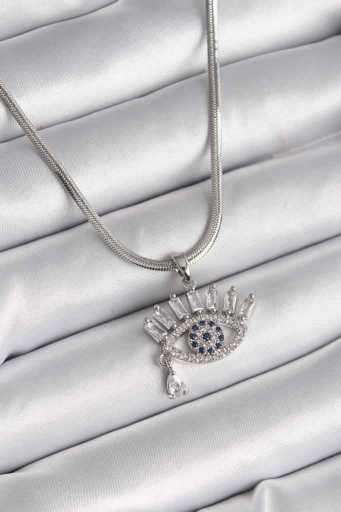 316L Çelik Gümüş Renk İtalyan Zincir Zirkon Taşlı Göz Model Kadın Kolye - TJ-BKO9598