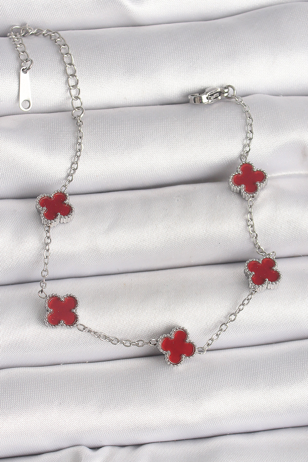316L Çelik Gümüş Renk Kırmızı Yonca Model Kadın Bileklik - TJ-BB6866