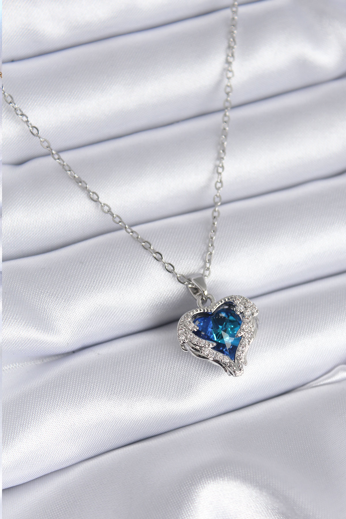 316L Çelik Gümüş Renk Mavi Kristal Kalp Model Zirkon Taşlı Kadın Kolye - TJ-BKO7772