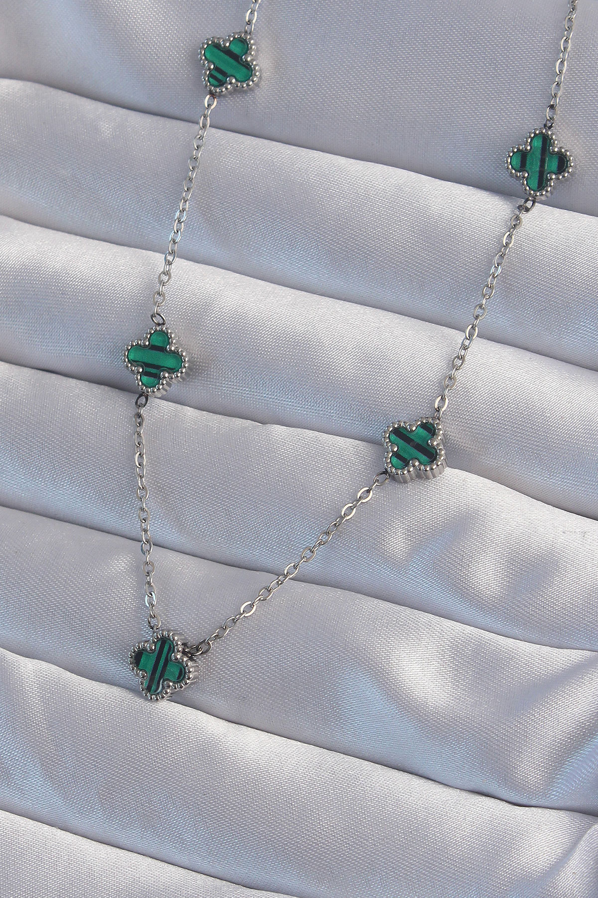 316L Çelik Gümüş Renk Minimal Yeşil Mineli Yonca Kolye - TJ-BKO8999