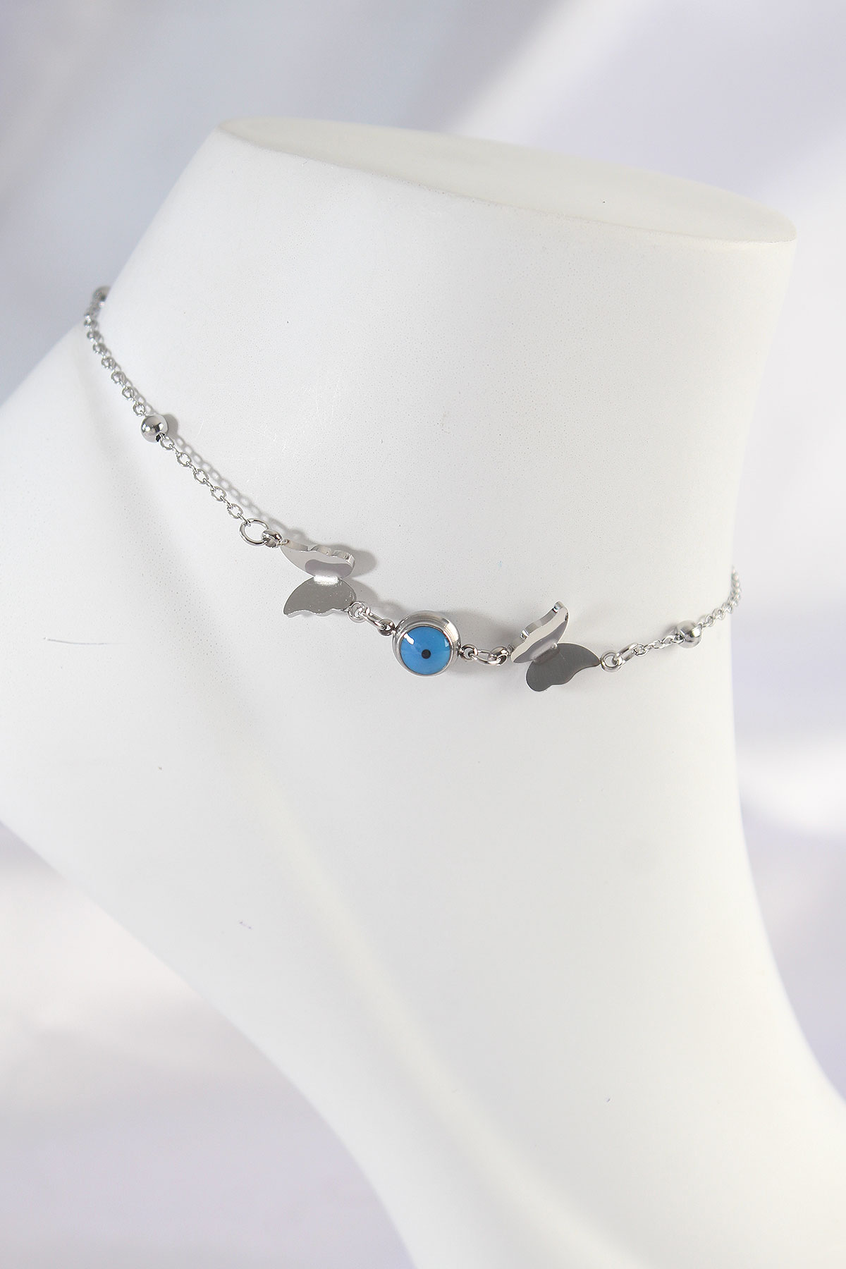 316L Çelik Gümüş Renk Nazar Boncuk Detay Kelebek Halhal - TJ-HH1602