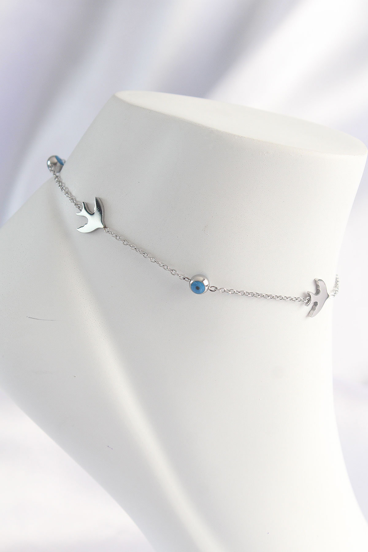 316L Çelik Gümüş Renk Nazar Boncuk Detay Kuş Tasarımlı Halhal - TJ-HH1617