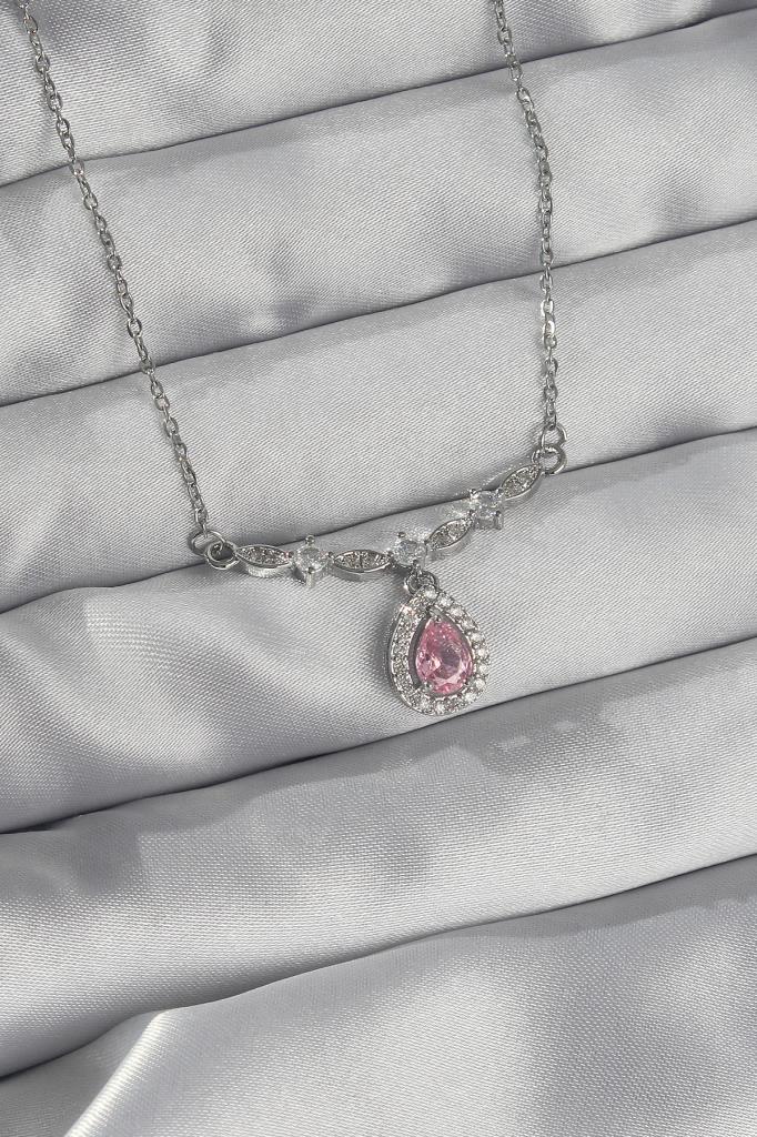 316L Çelik Gümüş Renk Pembe Zirkon Taşlı Damla Kolye - TJ-BKO8919