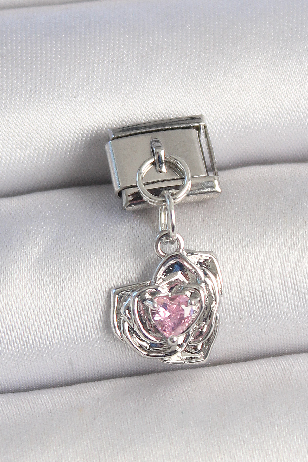 316L Çelik Gümüş Renk Pembe Zirkon Taşlı Kalpli Gül Model Nomination Charm - TJ-BC1335