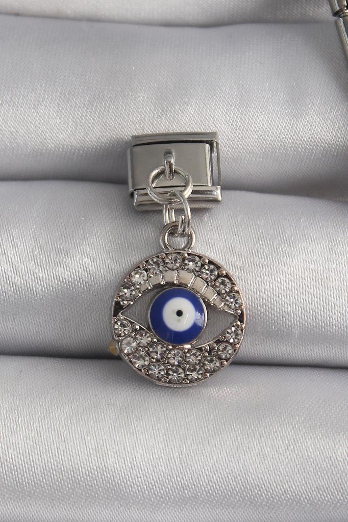 316L Çelik Gümüş Renk Sallantı Zirkon Taşlı Göz Model Nazar Boncuk Detay Nomination Charm - TJ-BC1121