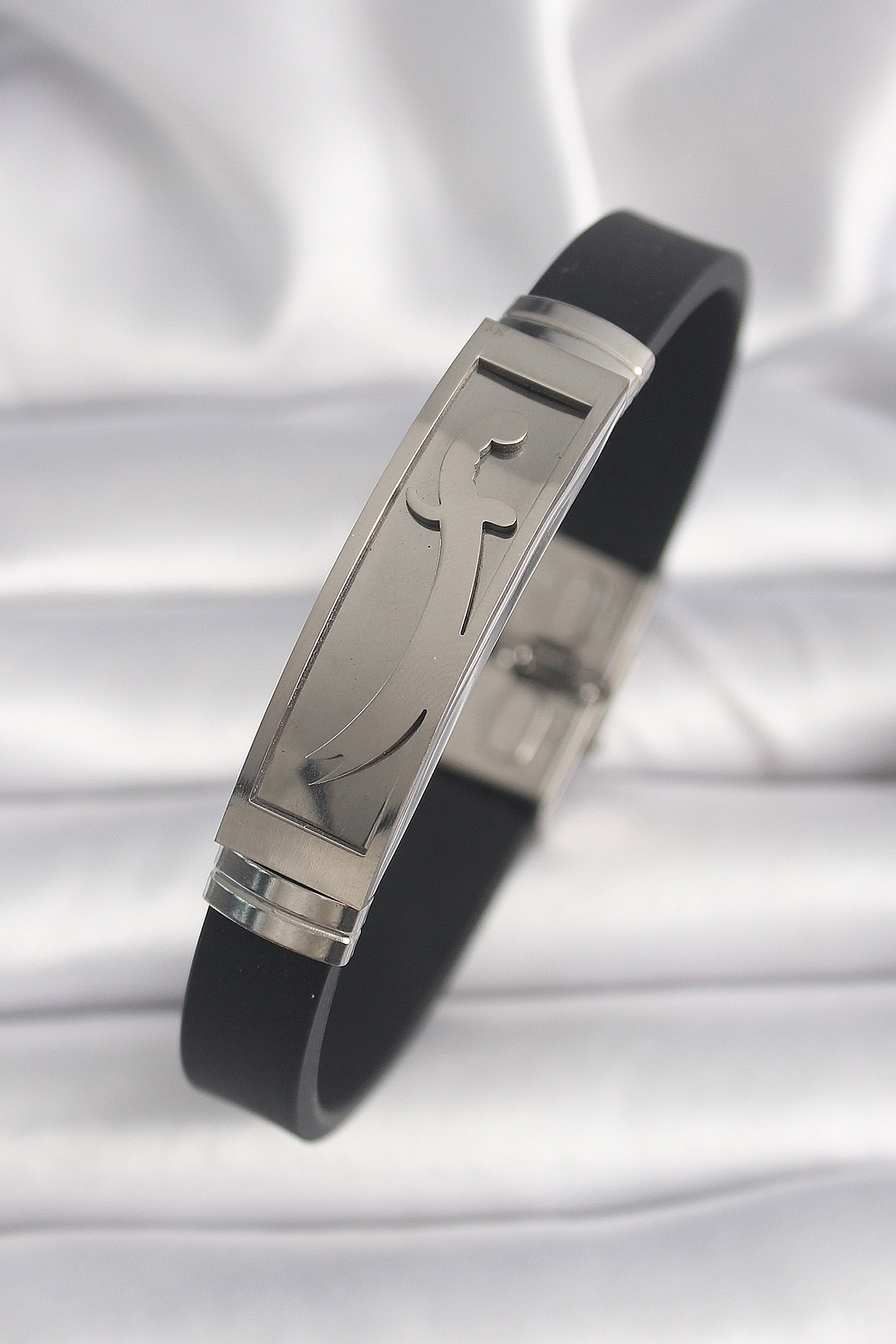316L Çelik Gümüş Renk Siyah Deri Kordon Zülfikar İşleme Erkek Bileklik - TJ-EB3696