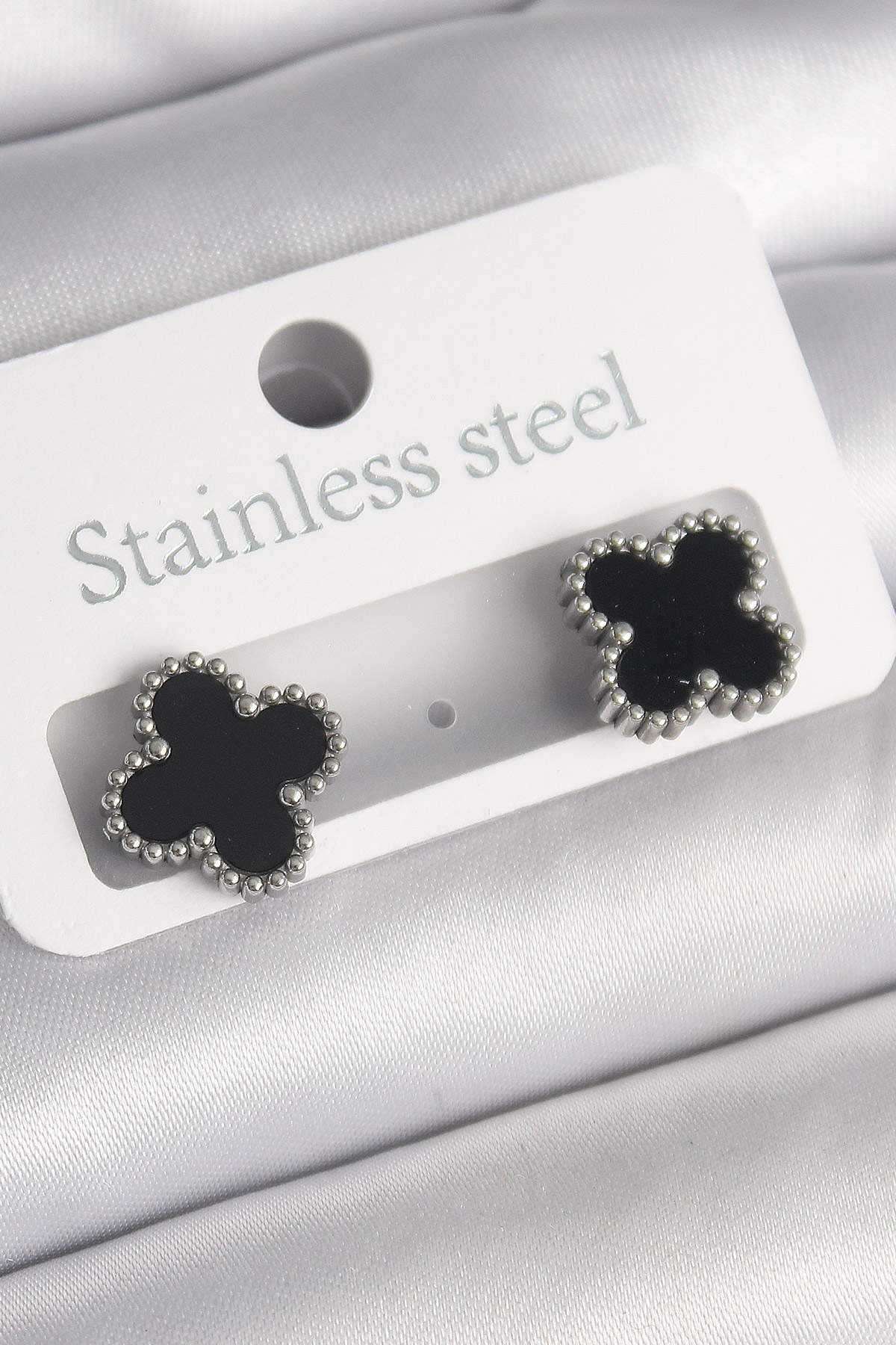 316L Çelik Gümüş Renk Siyah Yonca Model Kadın Küpe - TJ-BKP10201