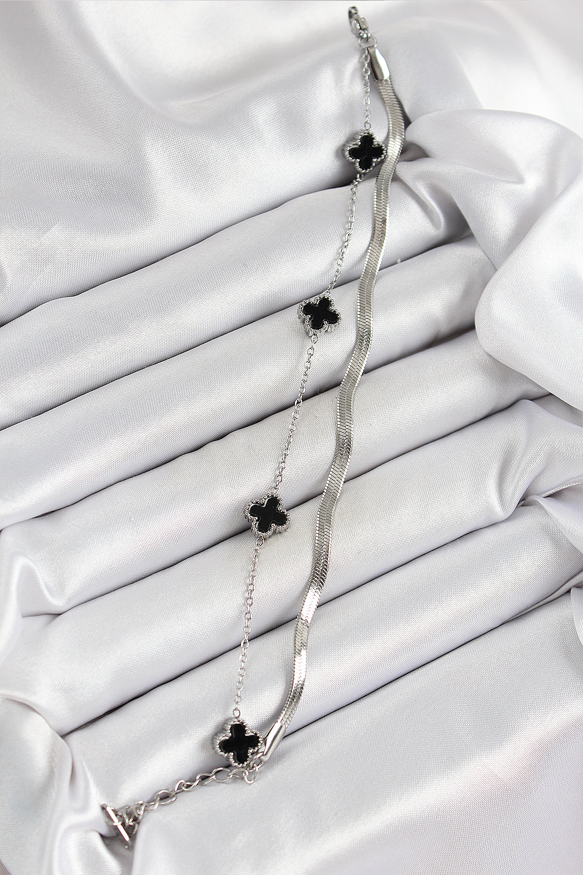 316L Çelik Gümüş Renk Siyah Yoncalı İtalyan Zincirli 2'li Kadın Bileklik - TJ-BB7081