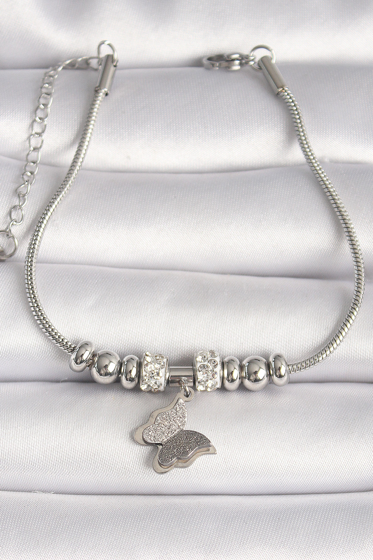 316L Çelik Gümüş Renk Tüp Zincir Model Zirkon Taş Detaylı Sallantı Simli Kelebek Figür Kadın Bileklik - TJ-BB6755