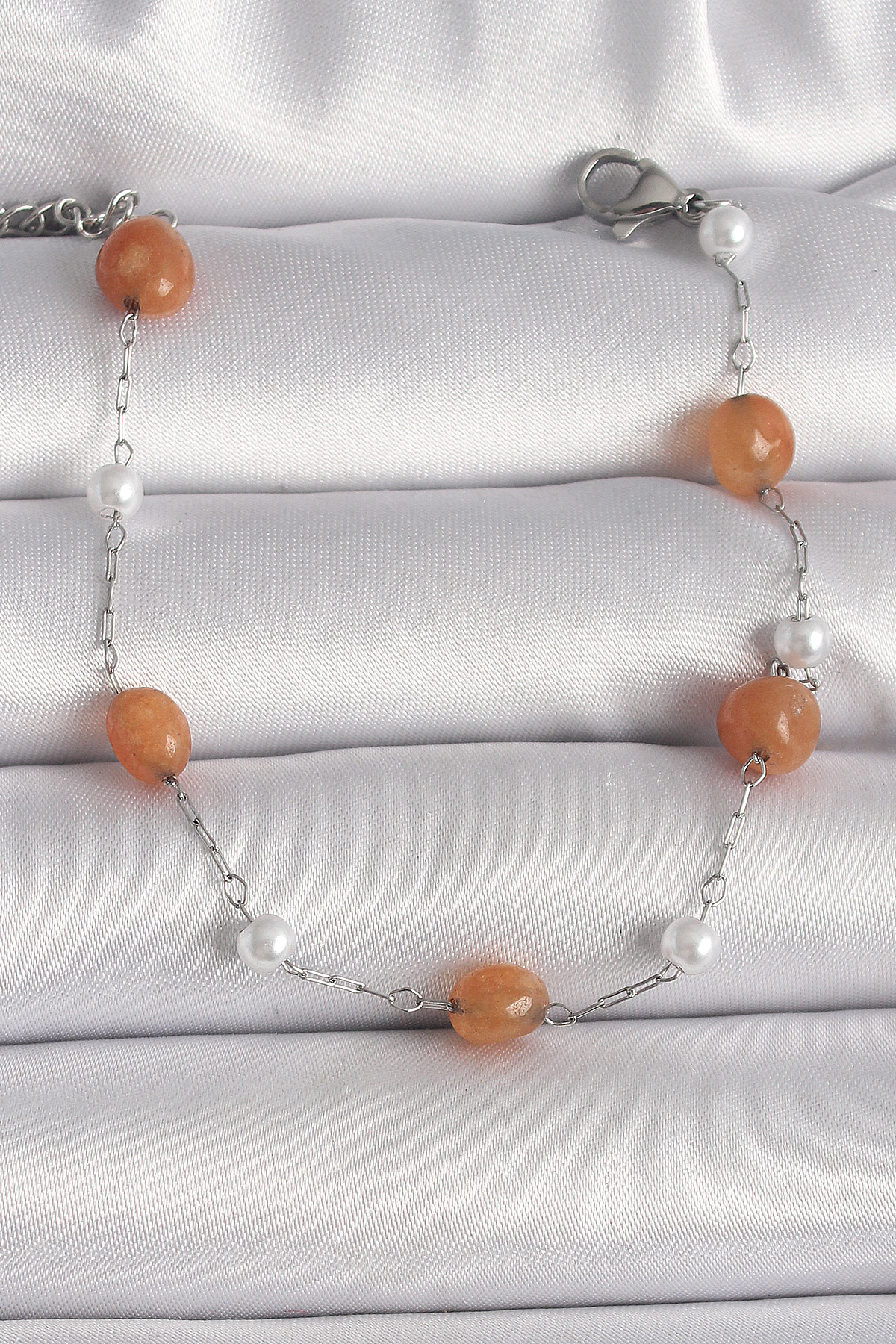 316L Çelik Gümüş Renk Turuncu Doğaltaş Model İnci Detay Kadın Bileklik - TJ-BB6602
