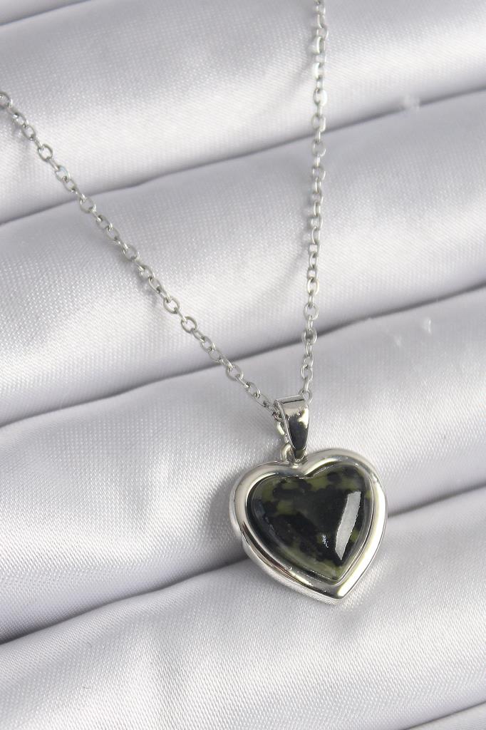 316L Çelik Gümüş Renk Yeşil Mineli Kalp Model Kadın Kolye - TJ-BKO9526